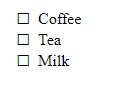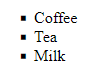 <ul style="list-style-type:square"> <li>Coffee</li> <li>Tea</li> <li>Milk</li> </ul>